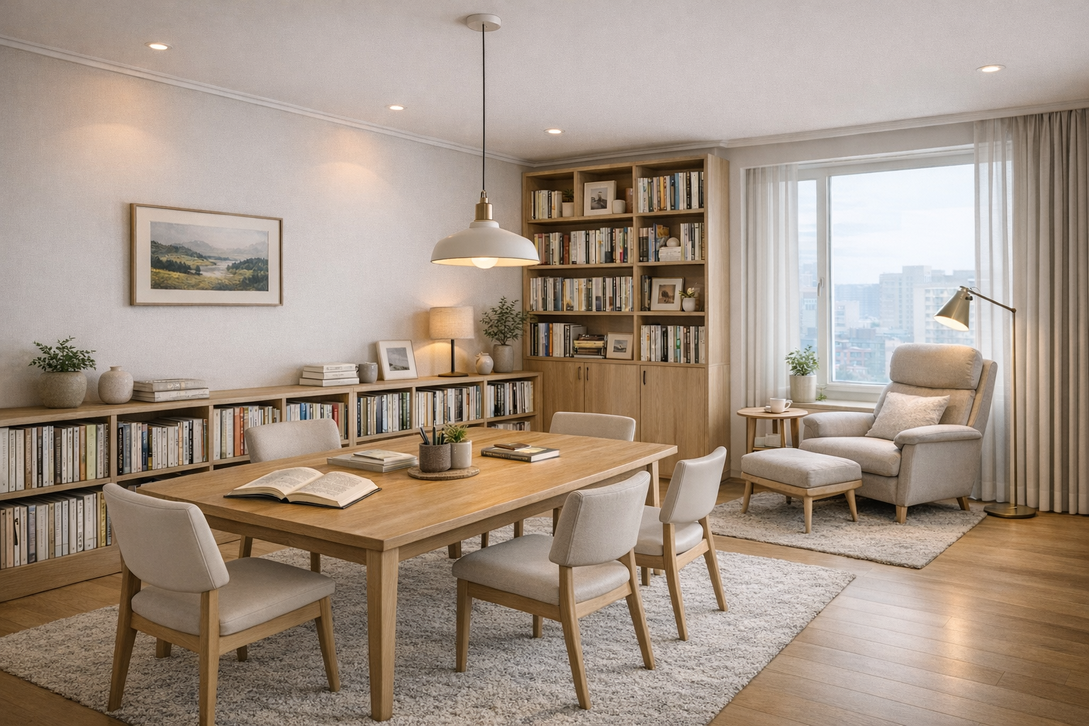 천장 매입등만으로는 이 조도를 확보하기 어렵습니다. 그래서 스탠드 조명이나 펜던트 조명을 추가로 설치하는 것을 추천합니다. 특히 테이블 위 펜던트 조명은 작업 영역에 집중 조명을 제공하고, 1인 체어 옆 플로어 스탠드는 독서 시 눈의 피로를 줄여줍니다.
