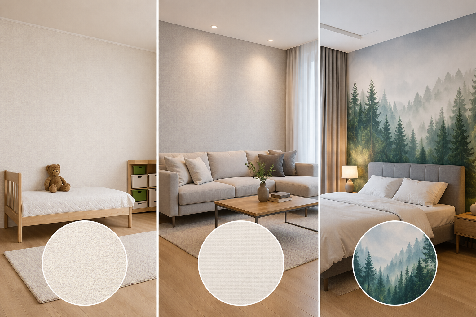 거실에는 실크벽지, 아이 방에는 합지벽지, 침실 포인트 벽에는 뮤럴벽지를 각각 시공했습니다. 같은 집 안에서 세 가지를 모두 경험하고 나니 비교가 한층 명확해졌습니다.